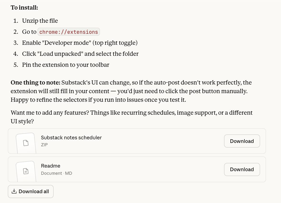 Help me build a new chrome extension tool for Substack. I want so schedule Notes in advance.Claude will create all the code files for you, even the icons. Download everything as a zip file.