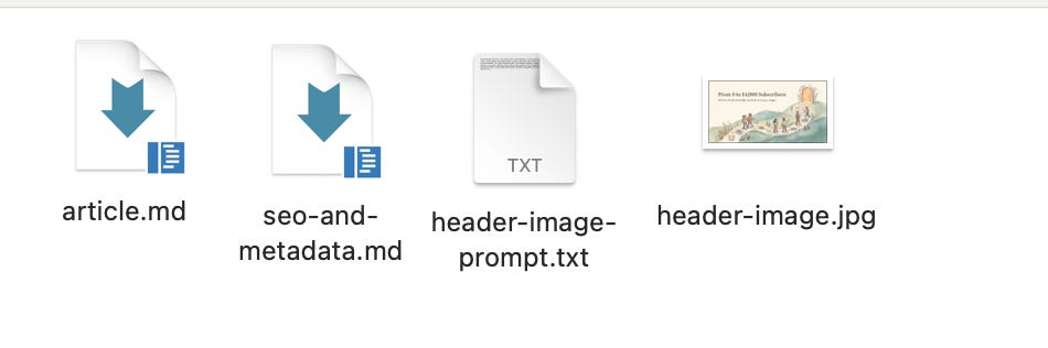 I gave Claude Code a single topic and it generated everything: headline, subtitle, SEO summary, header image prompt, the full article with all my CTAs, a Notes teaser, and three email subject line options. All in my writing style.